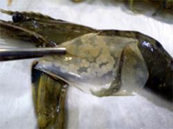 Prawns with white spot disease may have a loose shell with many white spots on the inside surface. The spots have a pink to red discolouration and are 0.5-2.0 mm in diameter.